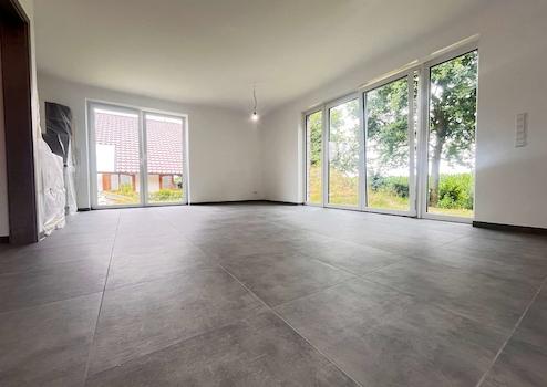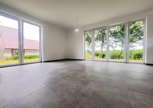Die bodentiefen Fensterelemente im Wohnbereich sorgen für helle, lichtdurchflutete Räume und eröffnen den direkten Zugang zum Garten, der nach eigenen Wünschen und Vorstellungen gestaltet werden kann. Auch das Schlafzimmer im Dachgeschoss ist mit bodentiefen Fenstern ausgestattet und bietet einen traumhaften Ausblick in die freie Natur.
