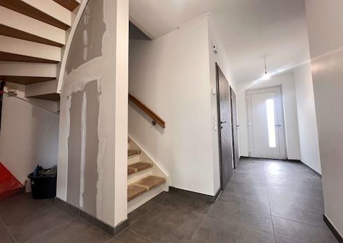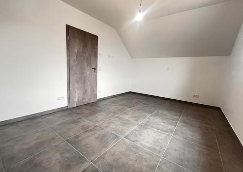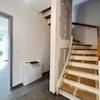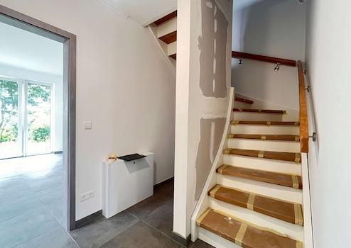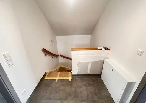 Die Bodenbeläge sind mit einheitlichen, hochwertigen Fliesen ausgestattet, die dem gesamten Wohnbereich eine klare, harmonische Linie verleihen. Besonders ins Auge fällt die geschmackvolle Treppe aus Holz, die als gestalterisches Highlight den Zugang zum Dachgeschoss bildet.