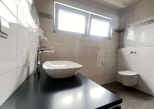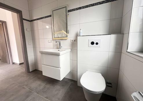 Das Haus verfügt über zwei vollwertige, modern ausgestattete Duschbäder – jeweils eines im Erdgeschoss und eines im Dachgeschoss. Durchdacht ist vor allem der Grundriss im Erdgeschoss, der neben dem offenen Wohn- und Essbereich auch ein Schlafzimmer und ein Duschbad umfasst. Somit ist bei Bedarf ein ebenerdiges Wohnen problemlos möglich.