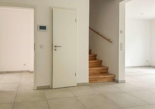 Alle Wohnräume sind mit einer Fußbodenheizung ausgestattet. Im Erdgeschoss sind moderne Fliesen verlegt, während Echtholzparkett in den oberen Geschossen das Raumgefühl aufwertet.