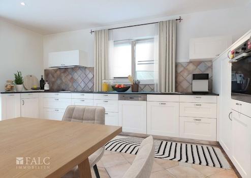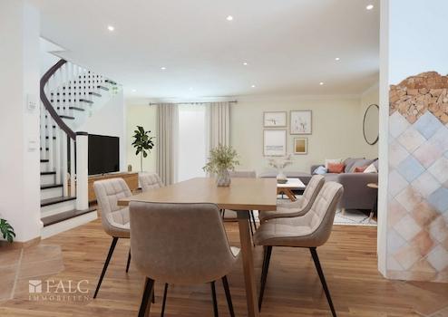 Weiter geht es in den offenen Wohnbereich, der durch seine großzügigen Fenster viel Tageslicht bietet. Der Wohnbereich ist harmonisch mit dem Essbereich verbunden, was eine ideale Umgebung für gesellige Abende schafft. Die angrenzende Küche ist modern ausgestattet und bietet ausreichend Platz für kulinarische Kreationen.