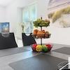Das großzügige Wohnzimmer bietet ein bequemes Sofa, einen Essbereich sowie eine offene, voll ausgestattete Küche. Von hier gelangen Sie direkt auf die sonnige Dachterrasse.