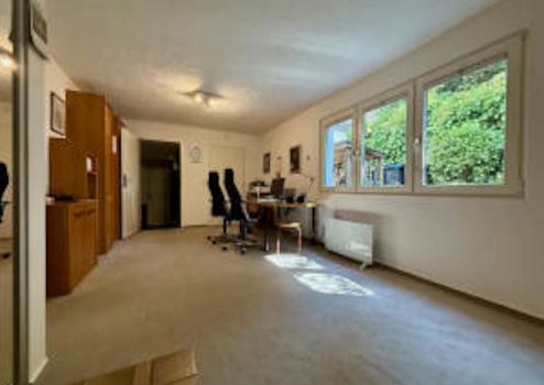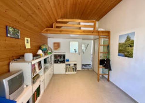 Die Einliegerwohnung verfügt neben einem eigenen Eingang über eine Wohnfläche von ca. 34 m² und bietet ein Arbeits- bzw. Schlaf- oder Gästezimmer, ein Duschbad nebst Sauna. Ein kellerähnlicher Abstellraum, wo derzeit u. a. eine kleine Werkstatt untergebracht ist, eignet sich als weitere Verstaufläche.