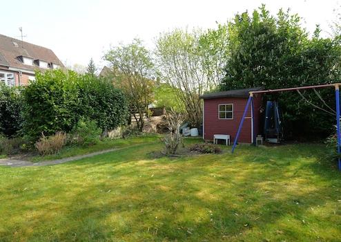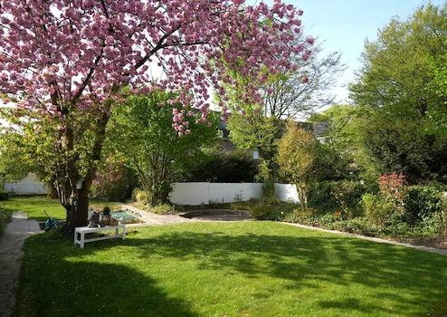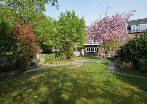 Der sehr große Garten ist wunderschön angelegt und durch den unteren Mieter sehr gepflegt. Ein Highlight ist der zentral platzierte Kirschbaum und die befestigten Wege mit Grillplatz bzw. Terrasse. Auf dem Grundstück finden Sie des Weiteren ein Gartenhaus und einen Kompostbereich.