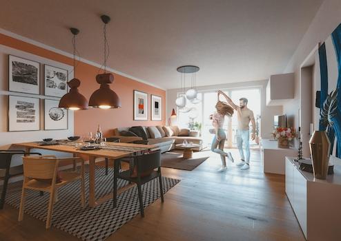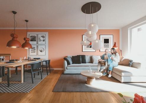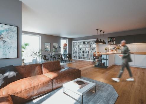 Die Wohnbereiche sind offen gestaltet und profitieren von großzügigen Fensterfronten, wodurch die Räume mit viel natürlichem Licht durchflutet werden. Umlaufende (Dach-) Terrassen und Balkone sorgen für eine großzügige Möglichkeit, sich im Freien aufzuhalten.