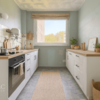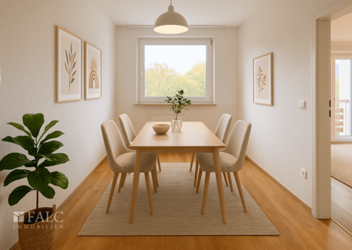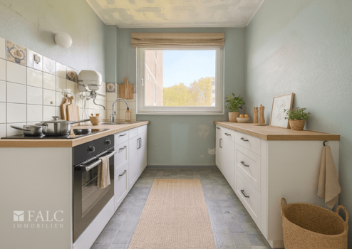 Eine separate Küche mit angrenzendem Essbereich schafft Raum für gemeinsames Kochen und Essen. Ein kleiner Abstellraum sorgt für zusätzlichen Stauraum und unterstreicht die praktische Aufteilung der Wohnung.