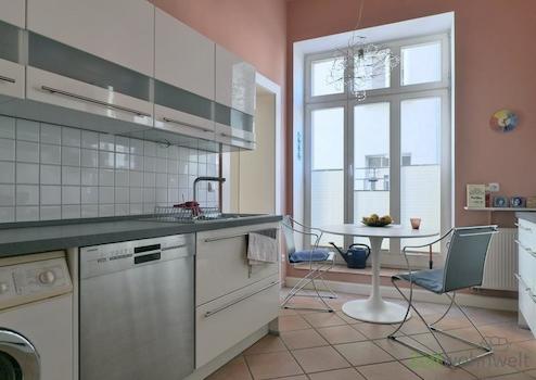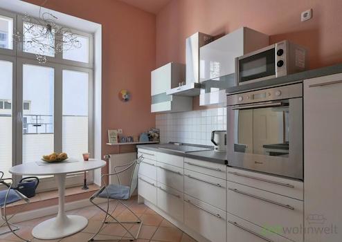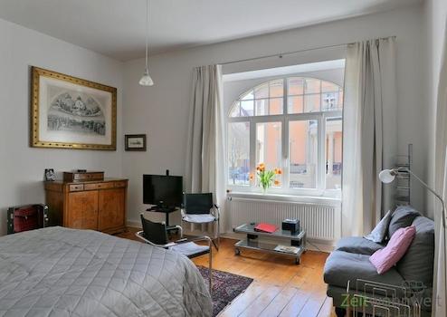 ### Please note the availability date! Bitte das Verfügbarkeitsdatum beachten! ### neu möbliertes Apartment in einem denkmalgeschützten Stadthaus nahe der Weimarer Innenstadt; WLAN und Reinigungsservice mit Wäschewechsel inklusive; großes Wohn-Schlafzimmer mit breitem Bett, historischer Kommode, Sofa, Sitzecke und TV; Wohnküche mit großer EBK, Waschmaschine und Esstisch am Fenster; kleine Bücher-Ecke im Wohnungsflur; modernes Bad mit Dusche und WC; Eingangsbereich mit Garderobenschrank; Pauschalmiete 995,00 Euro bei 1 Person; Kaution 1.500,00 Euro; auf Wunsch kann ein PKW-Stellplatz angemietet werden; Mindestmietdauer 3 Monate; einmalige Endreinigungspauschale 50,00 Euro; Pflichtangaben zum Energieausweis: Entfällt, Kulturdenkmal gemäß Thüringer Denkmalschutzgesetz (ThürDSchG)