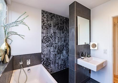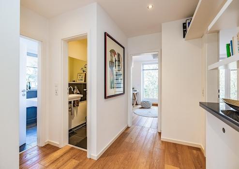 Die Böden in der gesamten Wohnung sind aus hochwertiger Eichendiele, während das Badezimmer mit großformatigen Fliesen ausgelegt ist.