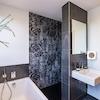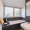 Das geräumige Schlafzimmer hat eine ausgedehnte Glasfront mit idyllischem Blick ins Grüne.