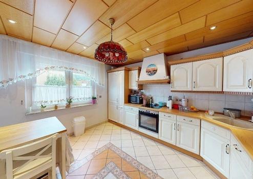 Ölzentralheizung Baujahr 1997 mit Kunststofftankanlage, Fußbodenheizung im Erdgeschoss, dekorativer Kaminofen für feste Brennstoffe im Wohn-Esszimmer – neuwertiger Edelstahlaußenkamin, 3-fach verglaste Kunststofffenster, Dach wurde 2000 neu eingedeckt, oberste Geschossdecke mit 20 cm Dämmwolle ausgelegt, die Stromversorgungsleitungen im Untergeschoss wurden 2024 komplett erneuert, ein Starkstromanschluss ist vorhanden, Zählerschrank mit zwei Stromzählern ist Baujahr 1989, Türsprechanlage mit Kamera, teilweise elektrische Rollläden; Böden: Fliesen (teilweise mit dekorativem hochwertigem Mosaik), Laminat, Vinyl und PVC; der Sichtschutzzaun zum Nachbarn wurde 2023 erneuert, im Kaufpreis sind zwei Küchen und ein Safe enthalten, das Haus befindet sich in sehr gepflegtem Zustand.