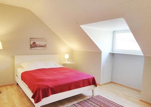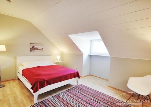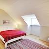 Im Schlafzimmer steht ein Doppelbett zur Verfügung. Die leichten Schrägen vermitteln ein gemütliches Wohnambiente