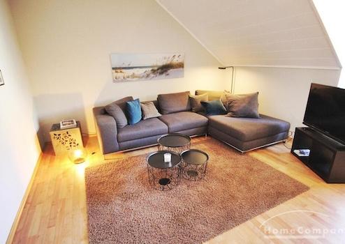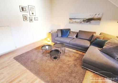 Sehr schöne Wohnung/ Penthouse- Aufstockung auf Bestandsgebäude Ausstattung Wohnen: Wohnzimmer mit Kamin und offener Küche, helles Leder Ecksofa, Flachbildschirm, Couchtisch, Küche: Einbauküche mit kompletter ...