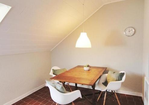 Die Wohnung ist geschmackvoll und gemütlich möbliert. Direkt neben der offenen und vollständig ausgestatteten Küche lädt ein gemütlicher Esstisch zum Bewirten von Gästen ein.