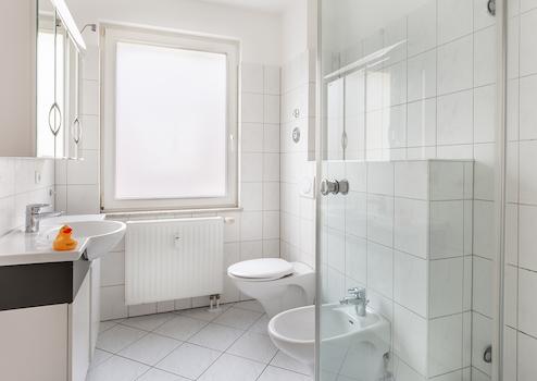 Ein weiterer Vorzug dieser geschmackvollen Immobilie ist das Badezimmer, welches in einem modernen, weißen Design gestaltet worden ist. Neben einem großen Fenster verfügt es über eine Dusche mit Glaskabine, ein Handwaschbecken, eine Toilette und ein Bidet. Ein Waschmaschinen-Anschluss steht Ihnen in der Abstellkammer zur Verfügung.