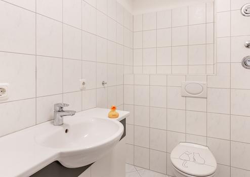 Abgerundet wird das Platzangebot durch ein separates, ebenfalls weiß gefliestes Gäste-WC (innen liegend).