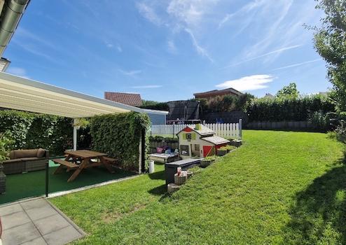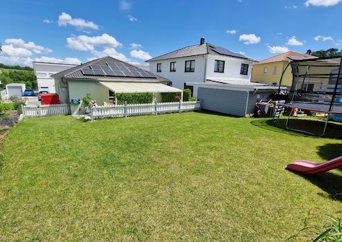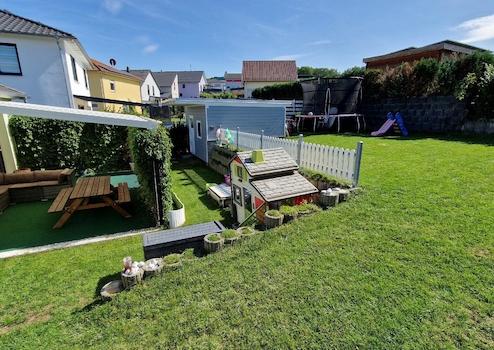 Mit insgesamt 4,5 Zimmer bietet das Haus ausreichend Platz. Es gibt drei helle Schlafzimmer, ein Tageslicht-Badezimmer mit bodengleicher Dusche, Badewanne und einer separaten Toilette. Die offene Gestaltung des Wohn- und Essbereichs sowie der Einbauküche schafft eine freundliche, einladende Atmosphäre. Angrenzend an die Küche befindet sich eine praktische Speisekammer, die zusätzlichen Stauraum bietet. Der Hauswirtschaftsraum, direkt am Eingang des Hauses, rundet das Angebot ab und sorgt für Ordnung. Über das Wohnzimmer gelangen Sie auf die großzügige, überdachte Terrasse, die einen wunderbaren Blick in den eigenen Garten bietet. Hier können Sie entspannen und die Natur genießen. Eine Gartenhütte bietet zusätzlichen Stauraum für Gartengeräte und andere Utensilien. Der Gartenbereich bietet viel Platz, um Ihre eigenen Gestaltungsideen umzusetzen.