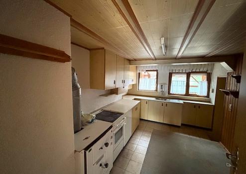 Die Erdgeschosswohnung besteht aus einer sehr geräumigen Wohnküche mit Zugang in den Garten und zum später angebauten Bad (mit Wanne, Waschbecken, WC und Wasserboiler mit zentraler Ölversorgung) sowie einem Wohnzimmer und einem Schlafzimmer.