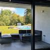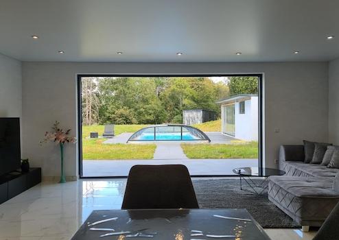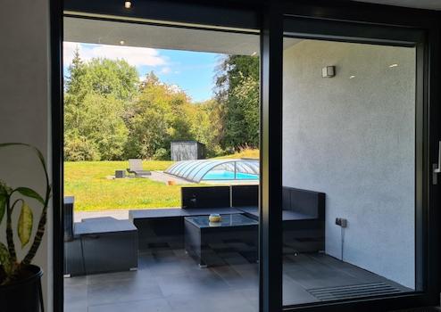Der Außenpool ist über eine separate Luft-Wasser-Wärmepumpe beheizbar, wobei die Wärme durch die verschiebbare Aluminium-Plexiglas-Überdachung kaum entweichen kann.