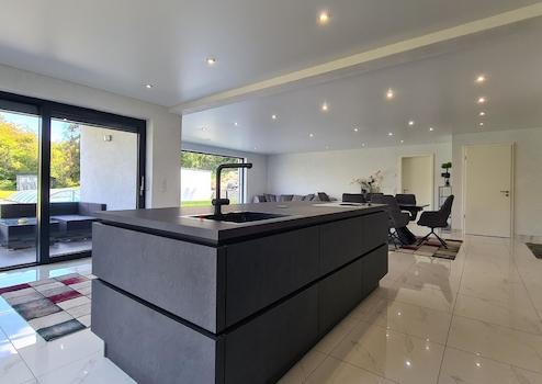 Die Innenwände sind im EG sowie in den Bädern mit hellgrauem Spachtellack und im OG mit weißem Glattputz versehen; die Decken sind als Spanndecken, satinweiß, mit eingelassenen dimmbaren LED-Leuchten ausgeführt.
