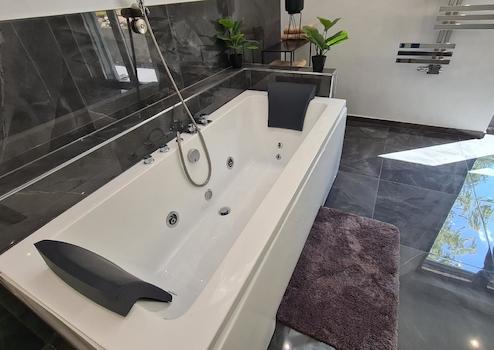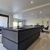 - Decken: Spanndecken, satin-weiß, mit eingelassenen dimmbaren LED-Leuchten