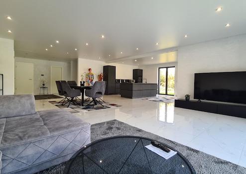 Entrée, Garderobe, Gäste-WC mit Dusche, Hauswirtschaftsraum, Gäste- oder Arbeitszimmer, großer offener Wohn-Ess- und Küchenbereich, ca. 75 m² mit hochwertiger moderner Einbauküche und Ausgang auf überdachte und große Freiterrasse, Schlaftrakt mit Schlafraum, Ankleide und luxuriös ausgestattetem Bad (Whirlpoolwanne, große bodengleiche Dusche mit Regendusche, großer Waschtisch mit Unterschrank, WC), kleiner Erschließungsflur mit direktem Zugang zur Doppelgarage, überdachte und Freiterrasse, insgesamt ca. 50 m² groß, mit Zugang zum Garten und Swimmingpool