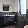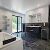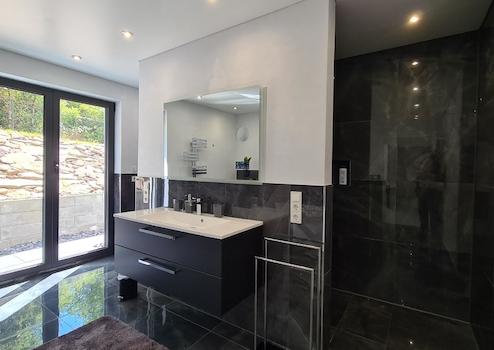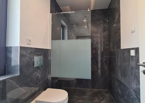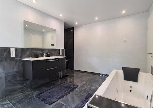 - Fußböden: großformatige Feinsteinzeugfliesen, 60 x 60 cm, weiß-grau marmoriert, in den Bädern anthrazitfarben