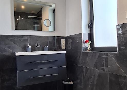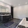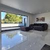 So sind die großformatigen (60 x 60 cm) Feinsteinzeugfliesen in den Wohn- und Schlafbereichen weiß-grau marmoriert, in den Bädern anthrazitfarben; ebenso sind die Küchen und auch die Aluminiumfenster anthrazitfarben.