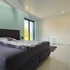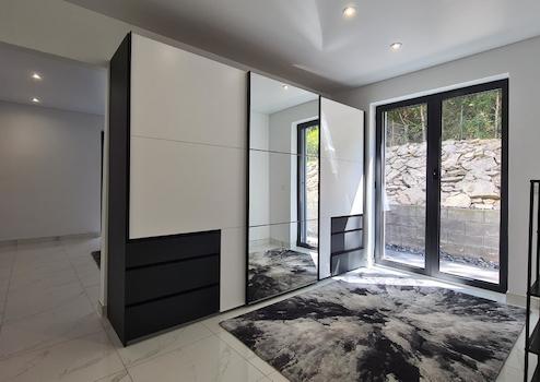 Die Innenausstattung des eleganten Anwesens ist als luxuriös zu bezeichnen, wobei der Kontrast zwischen weiß und schwarz ein besonderes Stilelement dieses eleganten Villenanwesens darstellt.