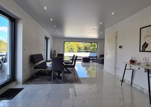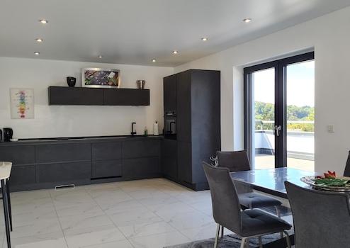Zweiter großer Wohnbereich ca. 62 m² mit offener Küche (und neuwertiger Einbauküche), Kinder- oder Gästezimmer, Gästebad (Dusche, Waschtisch, WC), Schlaftrakt (Schlafzimmer, Ankleide, luxuriöses Bad mit gleicher luxuriöser Ausstattung wie im EG), ca. 60 m² große Dachterrasse mit genialem unverbaubarem Fern- und Rundumblick