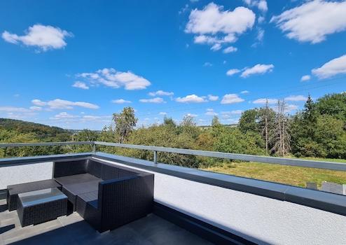 Zur Wohnung im Obergeschoß gehört eine ca. 60 m² große Dachterrasse mit unverbaubarem Fern- und Rundumblick.