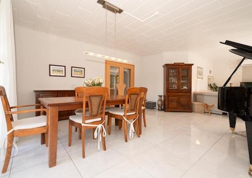 Das Erdgeschoss beeindruckt mit einem weitläufigen Wohn- und Essbereich, edlen Marmorfliesen sowie einer modernen Klimaanlage. Große Terrassentüren öffnen den Blick ins Grüne und sorgen für eine lichtdurchflutete Atmosphäre. Die hochwertige Einbauküche verbindet Funktionalität mit modernem Design. Ergänzt wird die Ebene durch ein Gäste-WC, eine Garderobe, ein Kinderzimmer mit eigener Klimaanlage sowie den direkten Zugang zur großzügigen Doppelgarage mit Spitzboden und Zugang zum weitläufigen Garten.