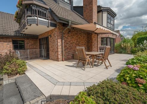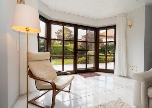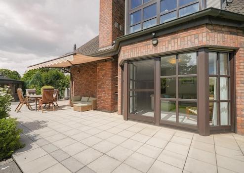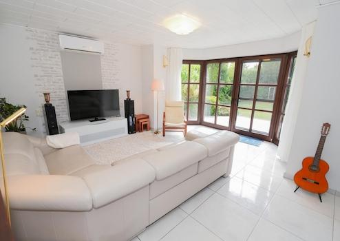 Die Ausstattung lässt keine Wünsche offen: Fußbodenheizung in allen Bereichen, elektrische Rollläden, zwei separate Klimaanlagen sowie ein hochwertiges Gartenhaus mit Bad, Schlafmöglichkeit und eigener Fußbodenheizung bieten höchsten Wohnkomfort. Ein weiteres massives Gartenhaus dient als praktischer Stauraum für Gartenutensilien. Die sonnige Terrasse mit Markise lädt zum Entspannen ein.