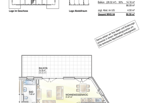 Die Wohnung besteht aus dem attraktiven Wohn/Essbereich von ca. 32 m² mit integrierter Küche und Zugang auf den großzügigen Balkon von ca. 29 m². Von der zentralen Diele erreichen Sie das geräumige Schlafzimmer von ca. 14 m², das Gäste-WC, den Abstellraum sowie das Bad mit Fenster von ca. 8 m². Die gesamte Wohnfläche beträgt ca. 87 m².