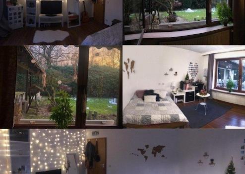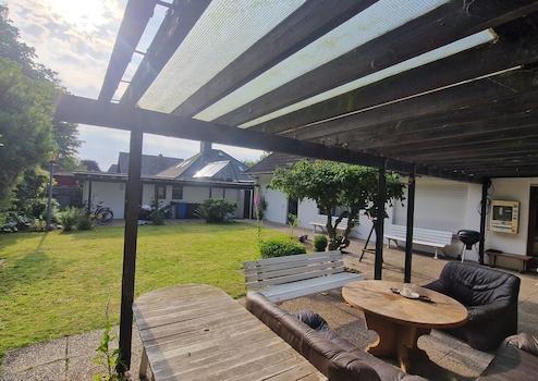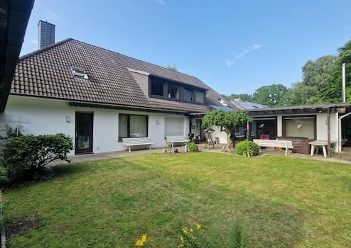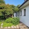 Die Gebäudefront mit Vorgarten und Stellplätzen weist Richtung Nord. Die Rückseite mit Terrasse und Garten in Richtung Süden. Der rückwärtige Bereich grenzt an einen größeren Teich, ist eingewachsen und dadurch von außen blickgeschützt.