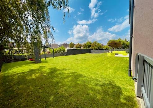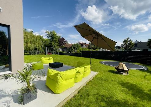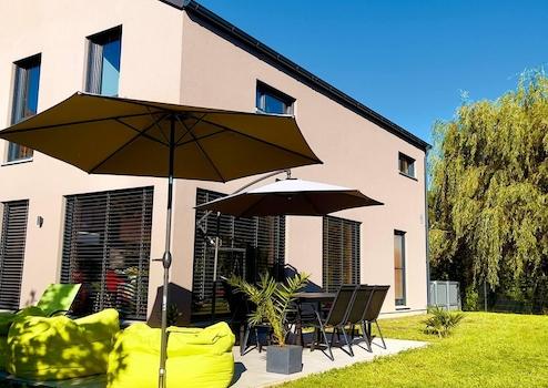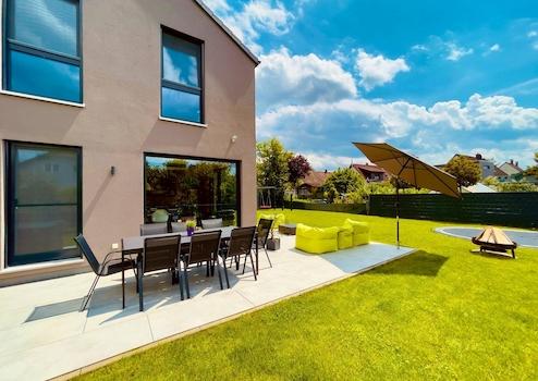 Die großzügige Terrasse lädt zum Verweilen ein und bietet Raum für gesellige Stunden im Freien. Eine Regenwasserzisterne ermöglicht eine nachhaltige Bewässerung des Gartens und spart zudem Niederschlagsteuer.