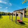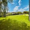 Der Gartenbereich mit einer großen grünen Wiese bietet Platz für individuelle Gestaltungsmöglichkeiten. Ein Gartenhaus mit kleiner Werkstatt ermöglicht kreative Tätigkeiten und die Aufbewahrung von Gartengeräten.
