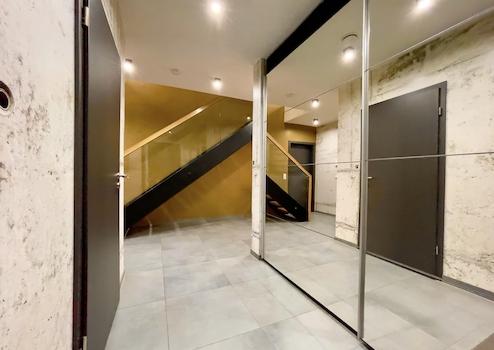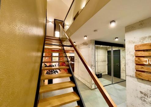 Die Inneneinrichtung besticht durch eine beeindruckende industrielle Ästhetik, geprägt von schwarz lackierten Stahlträgern, Wandverkleidungen mit Ziegelsteinblenden und Betonoptik.