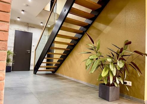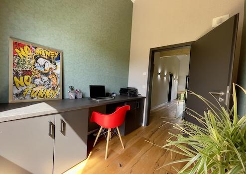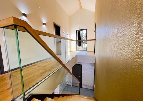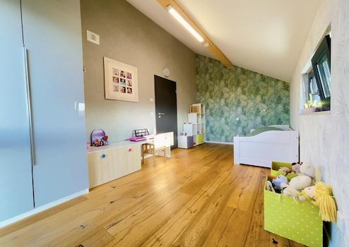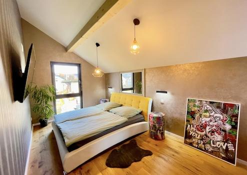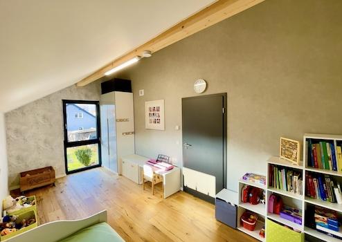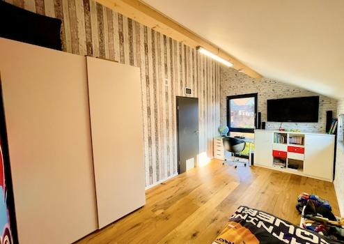 Jedes Zimmer erstrahlt durch schöne dekorative Wandverkleidung und das hochwertige rustikale Eiche Parkett, naturgeölt, welches einen warmen und einladenden Charakter schafft. Die großzügigen Raumhöhen im Erdgeschoss von 2.52m und im Obergeschoss mit einem lichten Kniestock von 1.80m verleihen dem Haus eine offene und einladende Atmosphäre. Die Designer-Treppe aus massivem Eichenholz mit Glasgeländer setzt dabei ein modernes Statement.