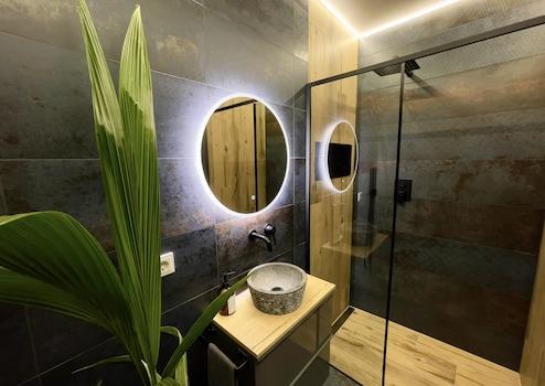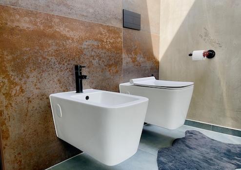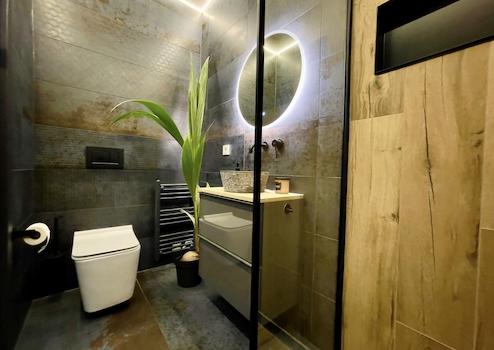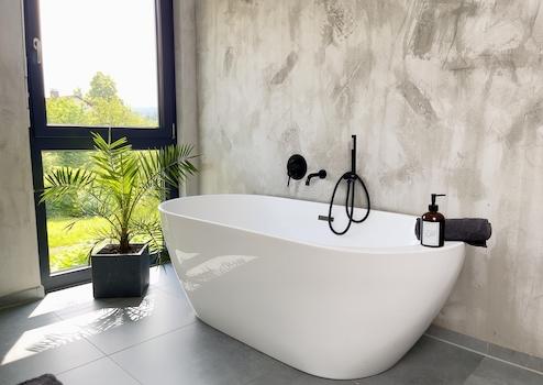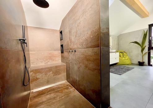 Die Badezimmer sind wahre Oasen der Entspannung. Im Erdgeschoss befindet sich ein Gäste-WC mit Dusche, das mit Designer Fliesen in Metall Rost Optik und in der Dusche mit Holzdielen in Goldbraun ausgestattet ist. Das obere Badezimmer begeistert mit hochwertiger Innengestaltung, inklusiven Wänden in Feinputztechnik-Schalbetonoptik und großzügige Dachfenster, das zusätzliches Tageslicht spendet. Modernste Sanitäranlagen und elegante Designelemente verleihen den Räumen ein einzigartiges Flair.