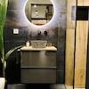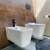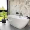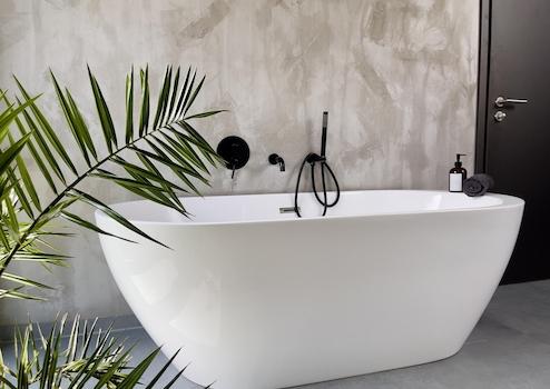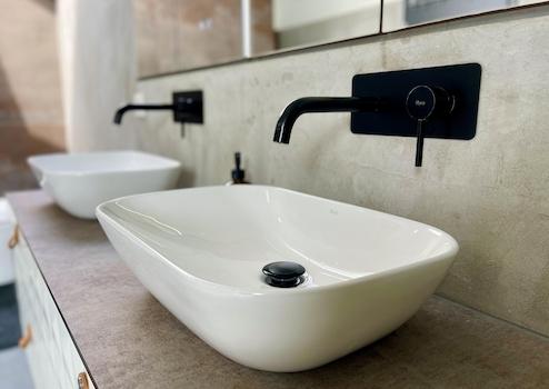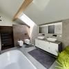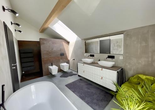 -Badezimmer Innengestaltung, Wände in Marmor-Feinputztechnik Schalbetonoptik, Großes Dachfenster (1,10m * 1,10m) für noch mehr Tageslicht im Badezimmer. Freistehende Badewanne, Doppelter Waschtisch mit eleganten Design Aufsatzwaschbecken und Unterputz Armatur in Black-Matt Optik. Die große Dusche lädt sie zu einem einzigartigen Erlebnis mit einer Regendusche ein. Die Wandbeläge sind mit italienischen Serenissima Ceramiche 1m*1m grossen Feinsteinzeugfliese in Metaloptik. Metallo Ruggine Ret. Moderne Hänge WC und Bidet mit einem eingebauten Spülkasten in der Wand.