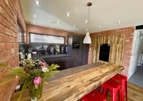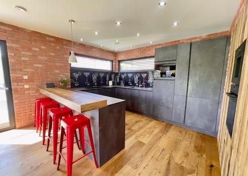 Die Küche ist ein Highlight für Gourmetliebhaber, ausgestattet mit einer hochwertigen Einbauküche von BALLERINA in edler Betonoptik. Diese überzeugt nicht nur durch modernes Design, sondern auch durch erstklassige Ausstattung mit energieeffizienten Geräten von BOSCH. Die langlebige dünne Arbeitsplatte und das flächenbündige BÄRBEL Induktionskochfeld mit integriertem Dunstanzug machen die Küche nicht nur optisch ansprechend, sondern auch funktional.