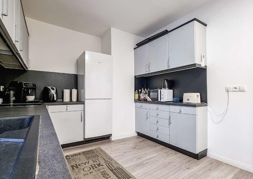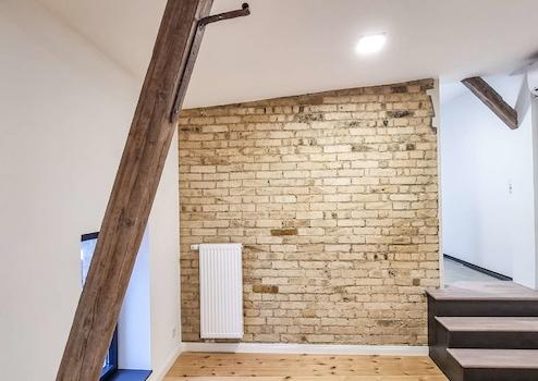 Der Wohnbereich des in den 1930er Jahren erbauten Nebengebäudes, wurde in solider Ziegelbauweise errichtet und ebenfalls saniert. Im Obergeschoss befindet sich ein großer Wohnraum mit aufgearbeitetem Sichtgebälk und Holzdielung. Eine kompakte Küche mit Einbauküche sowie ein Badezimmer mit Dusche finden sich hier ebenfalls wieder. Diese Räumlichkeiten eignen sich hervorragend als Einliegerwohnung, für erwachsene Familienmitglieder oder als Büro. Das Nebengebäude verfügt über einen separaten Stromzähler, was eine unabhängige Nutzung ermöglicht. Die Elektrik der Wohnbereiche und die Wasserleitungen wurden hier ebenfalls erneuert. Eine Klimaanlage ist vorhanden.