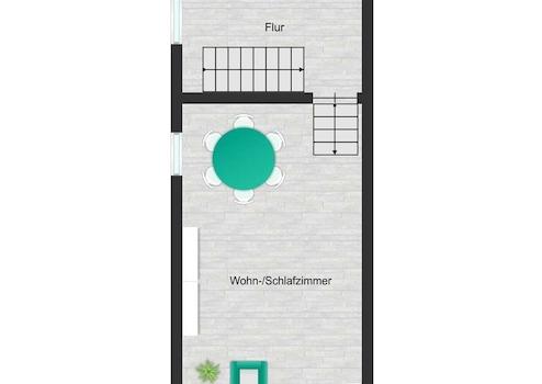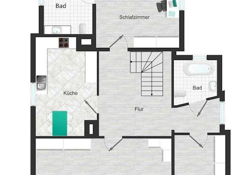 Erdgeschoss: Das Erdgeschoss bietet einen großen Wohnbereich mit angrenzender funktional gestalteter Küche. Eine Einbauküche ist bereits vorhanden. Neben einem zentral gelegenen Flur stehen ein Schlafzimmer und ein angrenzendes Arbeitszimmer zur Verfügung. Das Tageslichtbad ist hochwertig gefliest und mit einer übergroßen Dusche ausgestattet. Im Eingangsbereich befindet sich zusätzlich ein Gäste-WC. Der Heizungsraum sorgt für die effiziente Unterbringung der modernen Haustechnik. Eine Abstellkammer ist vorhanden.