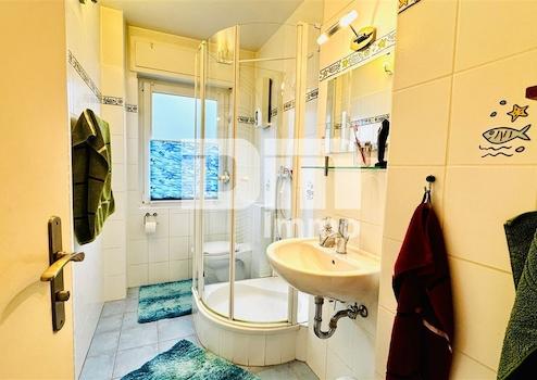 Ebenfalls gefliest (deckenhoch / zeitloses Design) ist das Tageslichtbad mit Dusche und Handtuchwärmer.