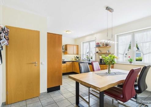Das Haus verfügt über einen großzügigen Wohnbereich, der mit seinen großen Fensterflächen viel Tageslicht bietet und direkten Zugang zur Terrasse ermöglicht. Dieser Raum bildet das Zentrum des Familienlebens und eignet sich ideal für entspannte Abende.