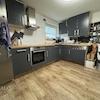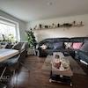 Moderne Bodenbeläge: Vinylboden im Wohnzimmer, Küche und Studio, Laminat in den Schlafräumen, hochwertige Fliesen im Eingangsbereich und Bädern.