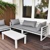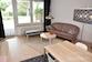 Wohnzimmer mit Sofa, Couchtisch, Esstisch mit 4 Stühlen, Schreibtisch mit Stuhl, Lowboard mit Kabel-TV, Laminat, Zugang zur