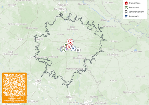 Die Hauptgemeinde Suderburg ist lediglich 5 Minuten mit dem Auto oder auch in 20 Minuten mit dem Fahrrad entfernt. Von Suderburg aus lässt sich ebenso per Bus und Bahn die Umgebung oder auch die eigene Anreise entspannt einrichten. Hier sind alle Geschäfte vorhanden, die für die Eigenversorgung gebraucht werden wie bspw. Supermärkte, Restaurants, Ärzte, Schulen und Kitas.
