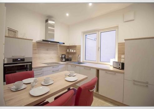 Ein Schlafzimmer mit komfortablem Doppelbett bietet Platz zum Entspannen. Der Wohnbereich ist mit einer gemütlichen Sitzecke ausgestattet und verfügt über einen Flachbild-TV. Ein Essbereich ist ebenfalls in diesem Raum integriert. Die benachbarte Küche inklusive Einbauküche und Zubehör ist zeitgemäß gestaltet und bietet viel Platz für Ihr Kochvergnügen.