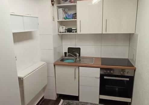 Außer dem Zimmer gibt es eine separate Küche mit anschließendem Vorratsraum,